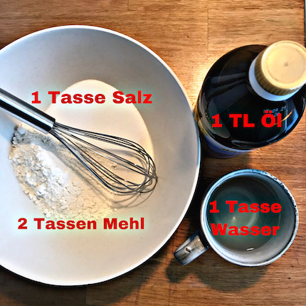 Mehl und Salz vermengen, dann das Wasser nach und nach hinzugeben. Den Teig kannst du mit den Händen oder der Küchenmaschine kneten. Mit etwas Pflanzenöl kannst du den Teig etwas geschmeidiger machen. Nach Belieben Lebensmittelfarbe hinzufügen.