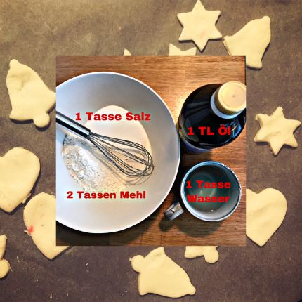 Dazu stellt ihr einen Salzteig her und stecht mit Plätzchen-Ausstechern weihnachtliche Formen aus. Mit einem Strohhalm oder Stift kann man Löcher in die Motive stechen.