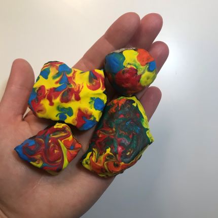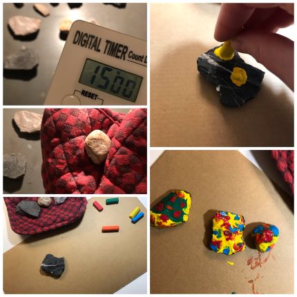 Drücke nun einen Wachsmalstift auf den heißen Stein und male ein wenig darüber. Die Farbe verläuft so über den Stein. Mit einem Löffel kann der Stein ggf. festgehalten werden, damit man sich nicht die Finger verbrennt.