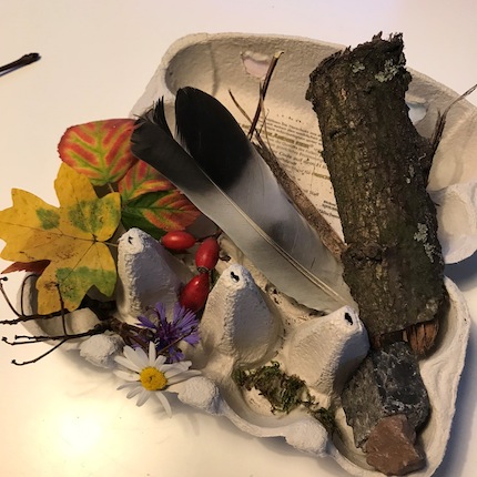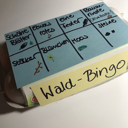 Wie funktioniert das? Dazu nimmst du einen Eierkarton und schreibst oben drauf, was in die Lücken gelegt werden soll. Was könnte man im Wald finden? Hier einige Vorschläge: Tannenzapfen; Baumrinde; Eichel; Steine; Blüte; Blatt; Moos; kleine Stöcke; kleine Feder; Schneckenhaus; etwas Rotes; …